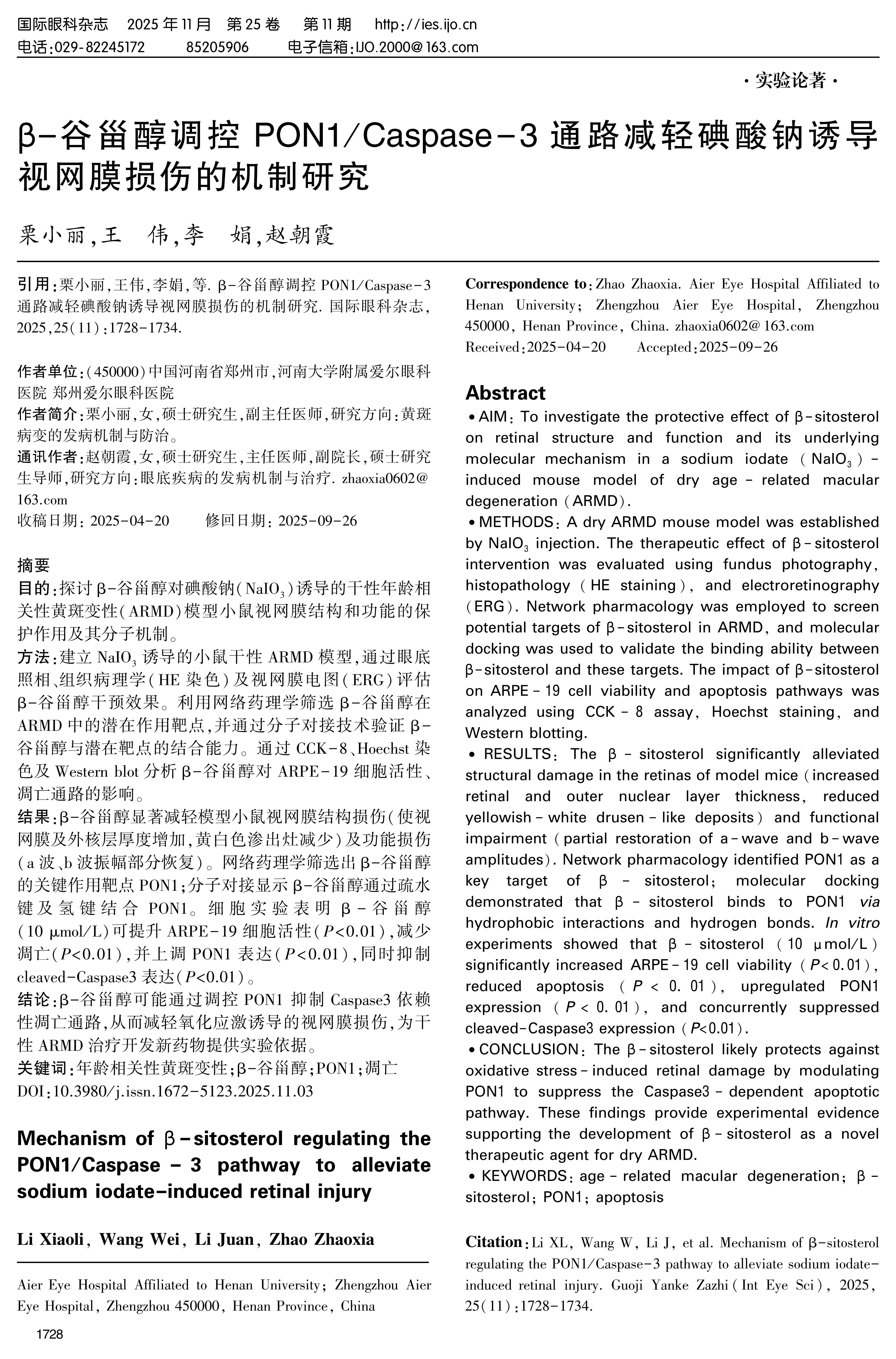 RESULTS: The β-sitosterol significantly alleviated structural damage in the retinas of model mice(increased retinal and outer nuclear layer thickness, reduced yellowish-white drusen-like deposits)and functional impairment(partial restoration of a-wave and b-wave amplitudes). Network pharmacology identified PON1 as a key target of β-sitosterol; molecular docking demonstrated that β-sitosterol binds to PON1 via hydrophobic interactions and hydrogen bonds. In vitro experiments showed that β-sitosterol(10 μmol/L)significantly increased ARPE-19 cell viability(P<0.01), reduced apoptosis(P<0.01), upregulated PON1 expression(P<0.01), and concurrently suppressed cleaved-Caspase3 expression(P<0.01).