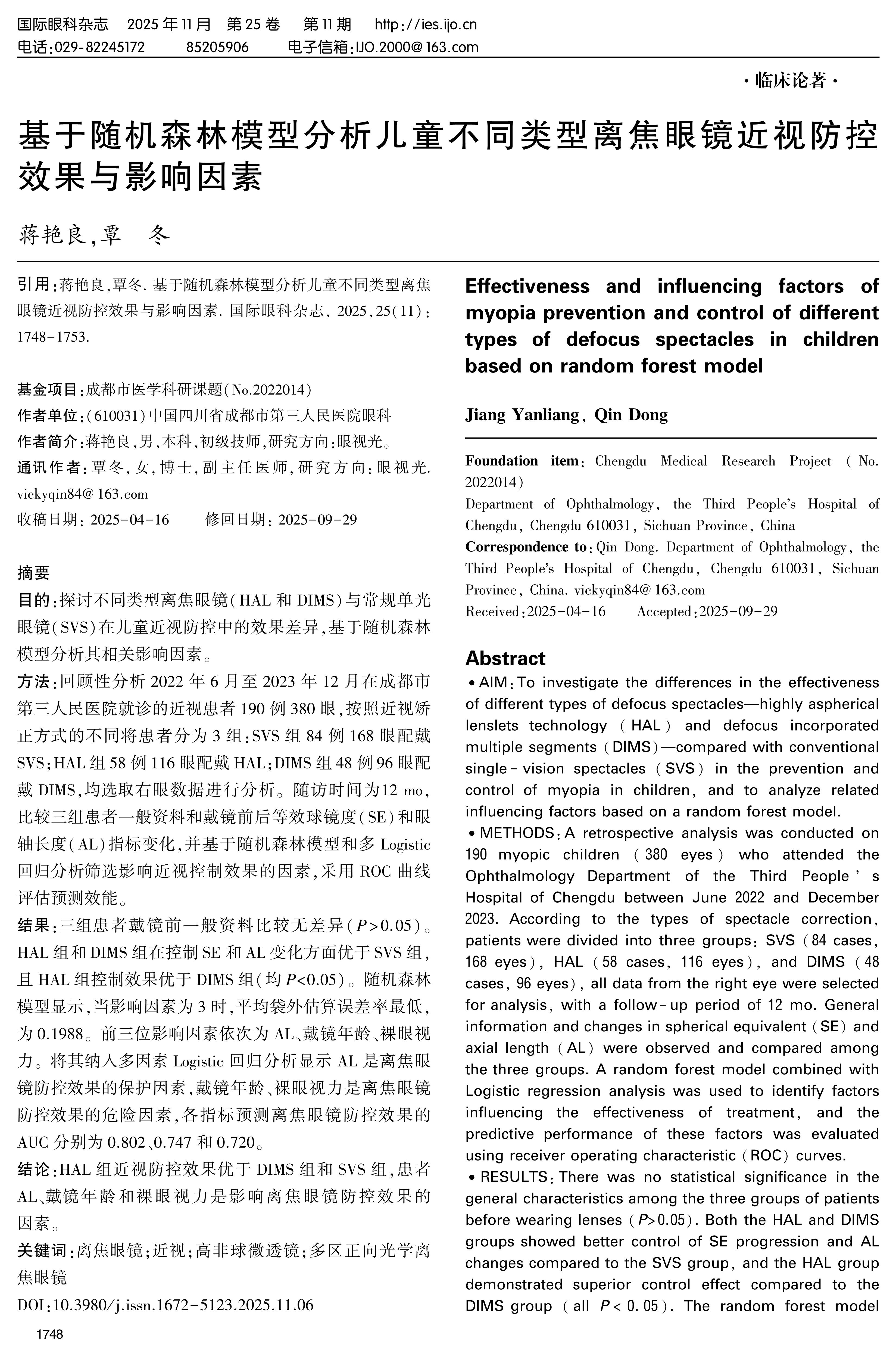 目的:探讨不同类型离焦眼镜(HAL和DIMS)与常规单光眼镜(SVS)在儿童近视防控中的效果差异,基于随机森林模型分析其相关影响因素。