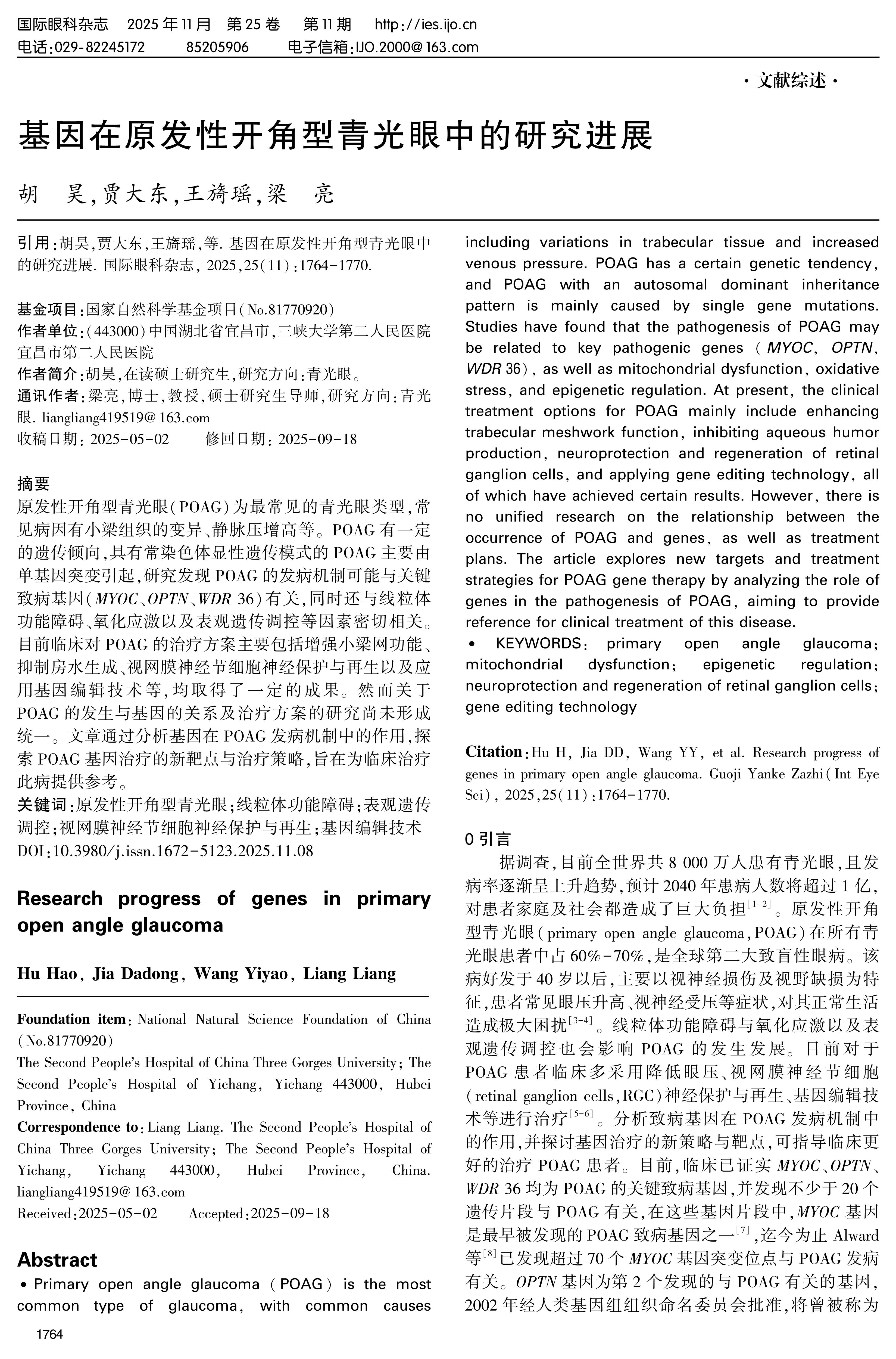 Primary open angle glaucoma(POAG)is the most common type of glaucoma, with common causes including variations in trabecular tissue and increased venous pressure. POAG has a certain genetic tendency, and POAG with an autosomal dominant inheritance pattern is mainly caused by single gene mutations. Studies have found that the pathogenesis of POAG may be related to key pathogenic genes(MYOC, OPTN, WDR 36), as well as mitochondrial dysfunction, oxidative stress, and epigenetic regulation. At present, the clinical treatment options for POAG mainly include enhancing trabecular meshwork function, inhibiting aqueous humor production, neuroprotection and regeneration of retinal ganglion cells, and applying gene editing technology, all of which have achieved certain results. However, there is no unified research on the relationship between the occurrence of POAG and genes, as well as treatment plans. The article explores new targets and treatment strategies for POAG gene therapy by analyzing the role of genes in the pathogenesis of POAG, aiming to provide reference for clinical treatment of this disease.