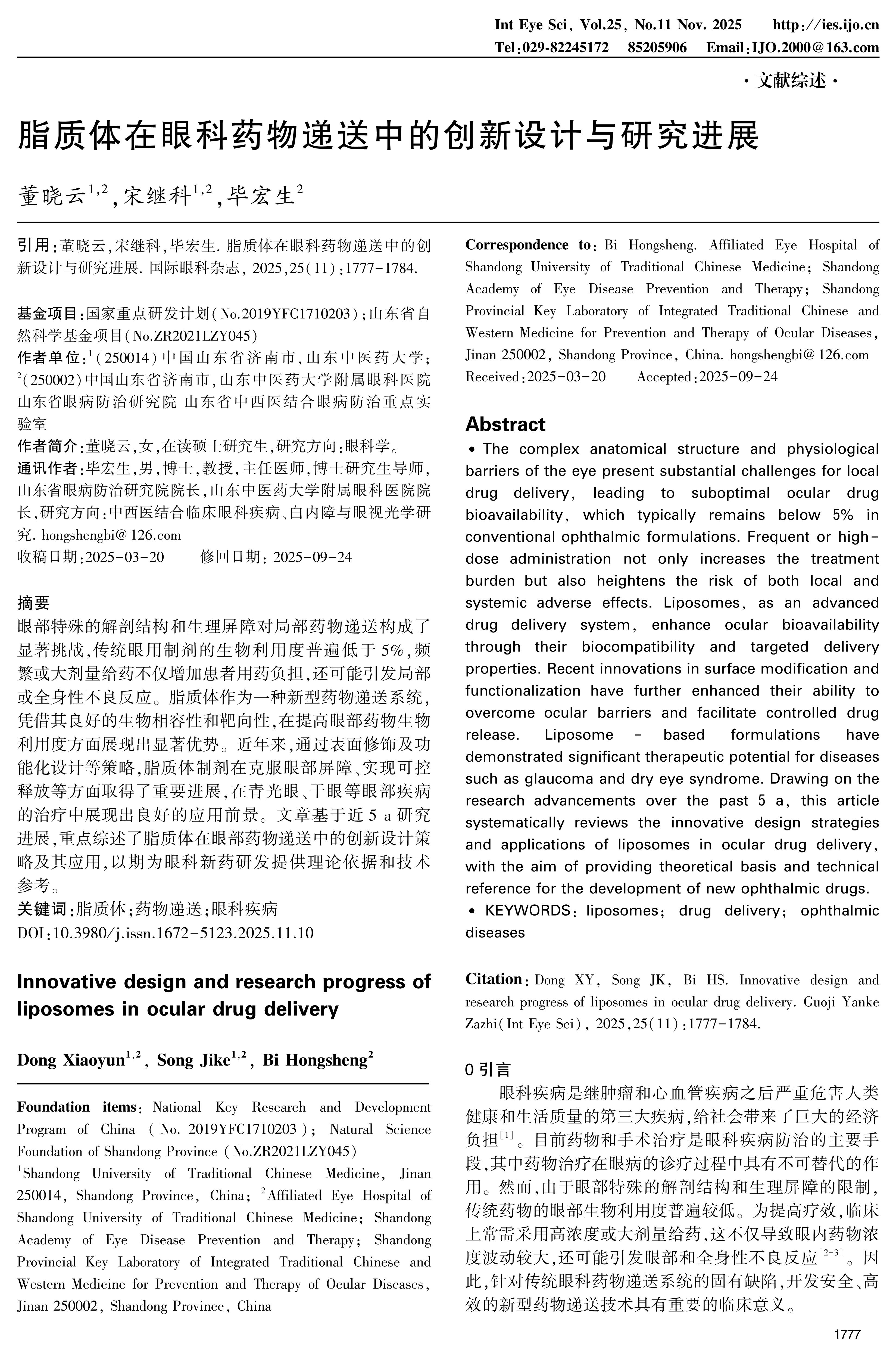 眼部特殊的解剖结构和生理屏障对局部药物递送构成了显著挑战,传统眼用制剂的生物利用度普遍低于5%,频繁或大剂量给药不仅增加患者用药负担,还可能引发局部或全身性不良反应。脂质体作为一种新型药物递送系统,凭借其良好的生物相容性和靶向性,在提高眼部药物生物利用度方面展现出显著优势。近年来,通过表面修饰及功能化设计等策略,脂质体制剂在克服眼部屏障、实现可控释放等方面取得了重要进展,在青光眼、干眼等眼部疾病的治疗中展现出良好的应用前景。文章基于近5 a研究进展,重点综述了脂质体在眼部药物递送中的创新设计策略及其应用,以期为眼科新药研发提供理论依据和技术参考。