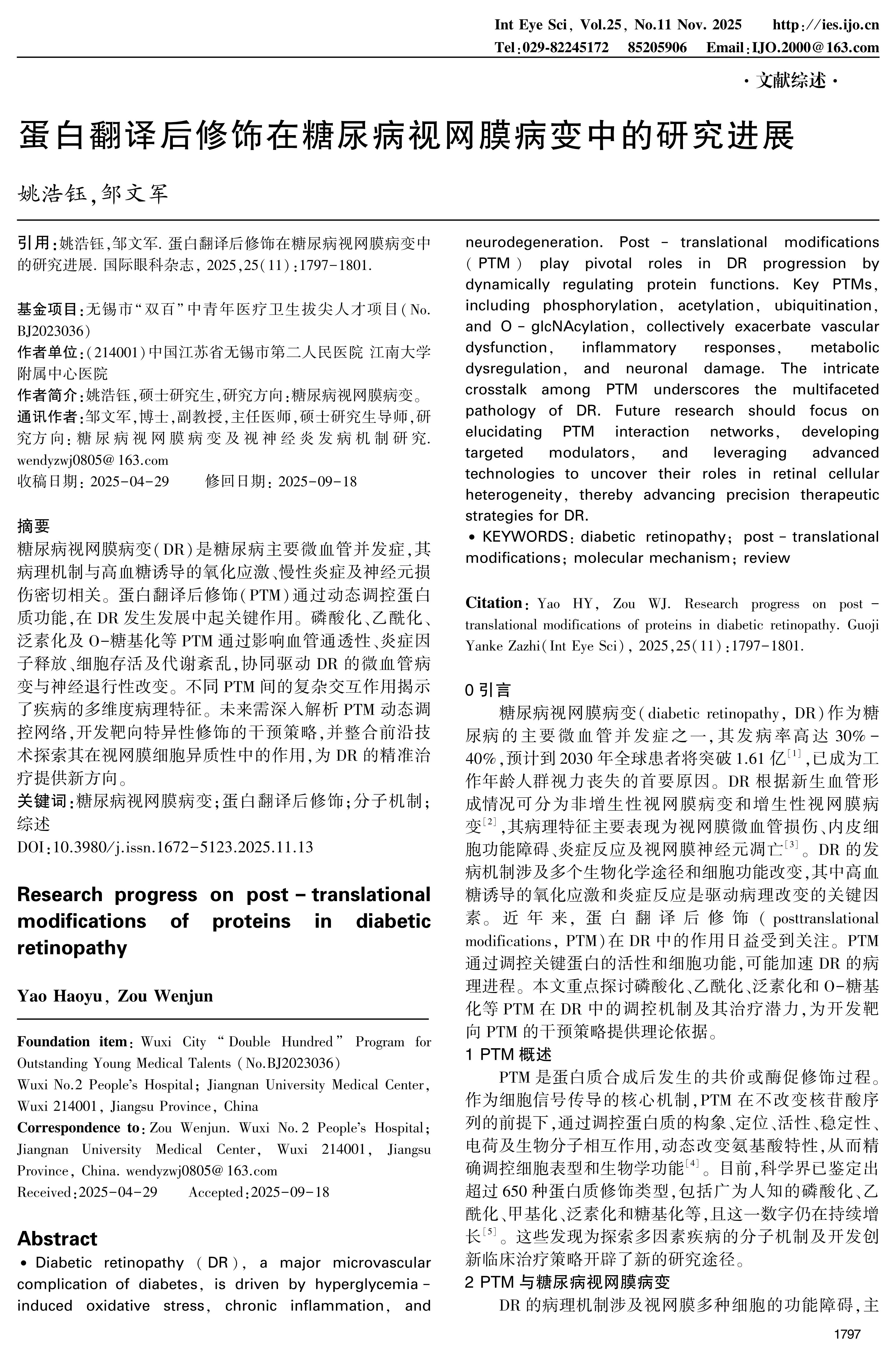 糖尿病视网膜病变(DR)是糖尿病主要微血管并发症,其病理机制与高血糖诱导的氧化应激、慢性炎症及神经元损伤密切相关。蛋白翻译后修饰(PTM)通过动态调控蛋白质功能,在DR发生发展中起关键作用。磷酸化、乙酰化、泛素化及O-糖基化等PTM通过影响血管通透性、炎症因子释放、细胞存活及代谢紊乱,协同驱动DR的微血管病变与神经退行性改变。不同PTM间的复杂交互作用揭示了疾病的多维度病理特征。未来需深入解析PTM动态调控网络,开发靶向特异性修饰的干预策略,并整合前沿技术探索其在视网膜细胞异质性中的作用,为DR的精准治疗提供新方向。