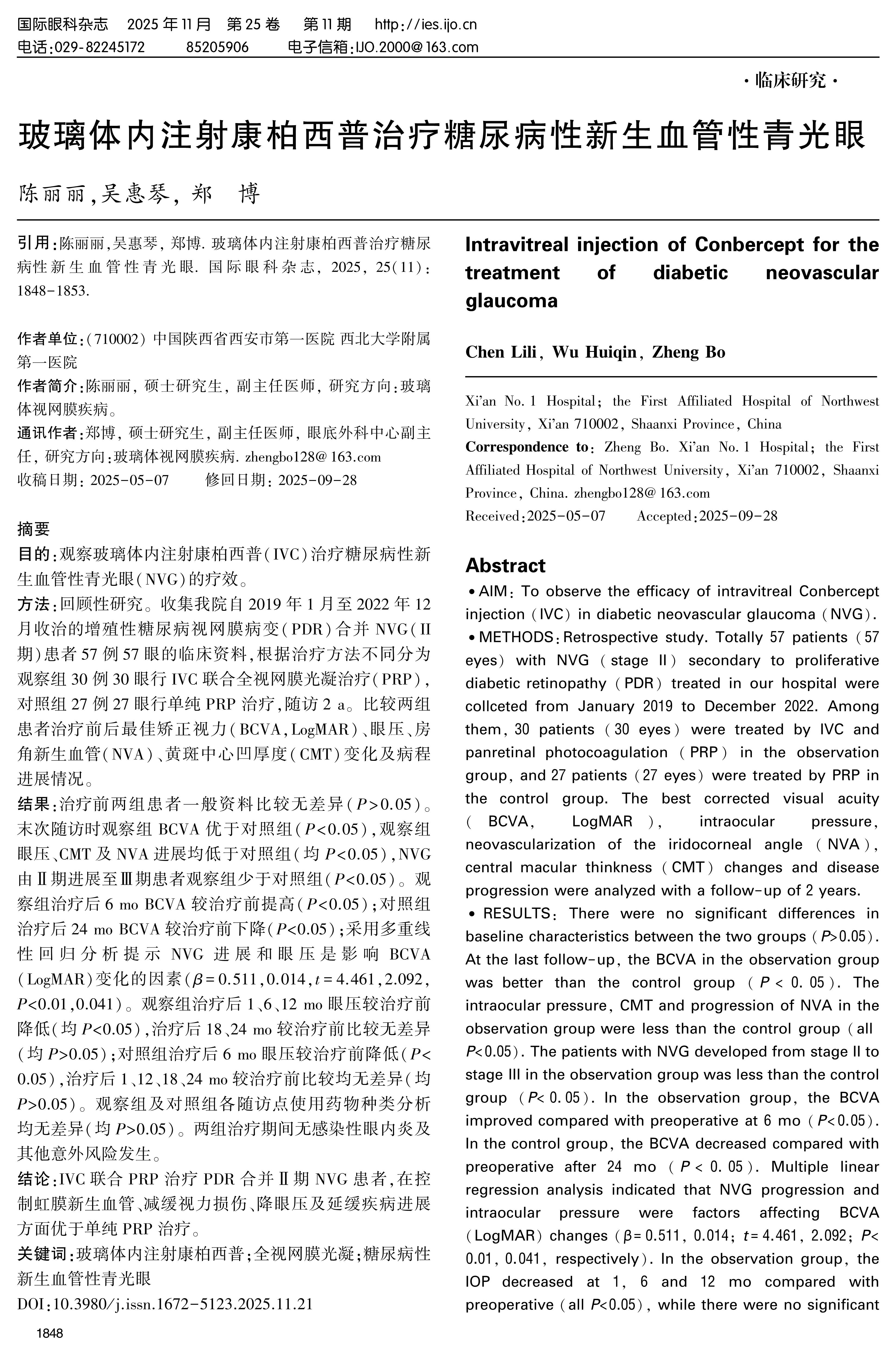 结论:IVC联合PRP治疗PDR合并Ⅱ期NVG患者,在控制虹膜新生血管、减缓视力损伤、降眼压及延缓疾病进展方面优于单纯PRP治疗。