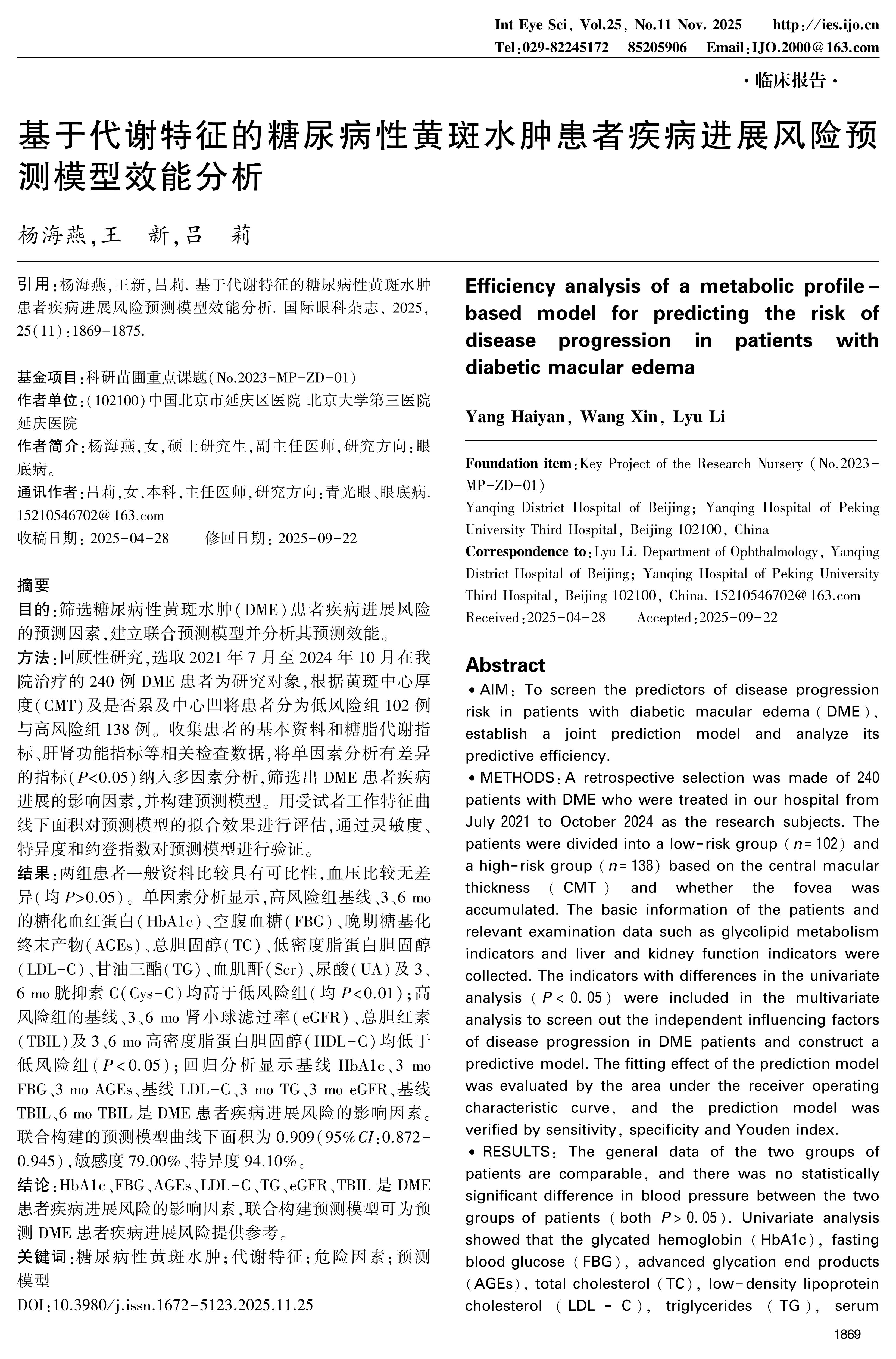 目的:筛选糖尿病性黄斑水肿(DME)患者疾病进展风险的预测因素,建立联合预测模型并分析其预测效能。