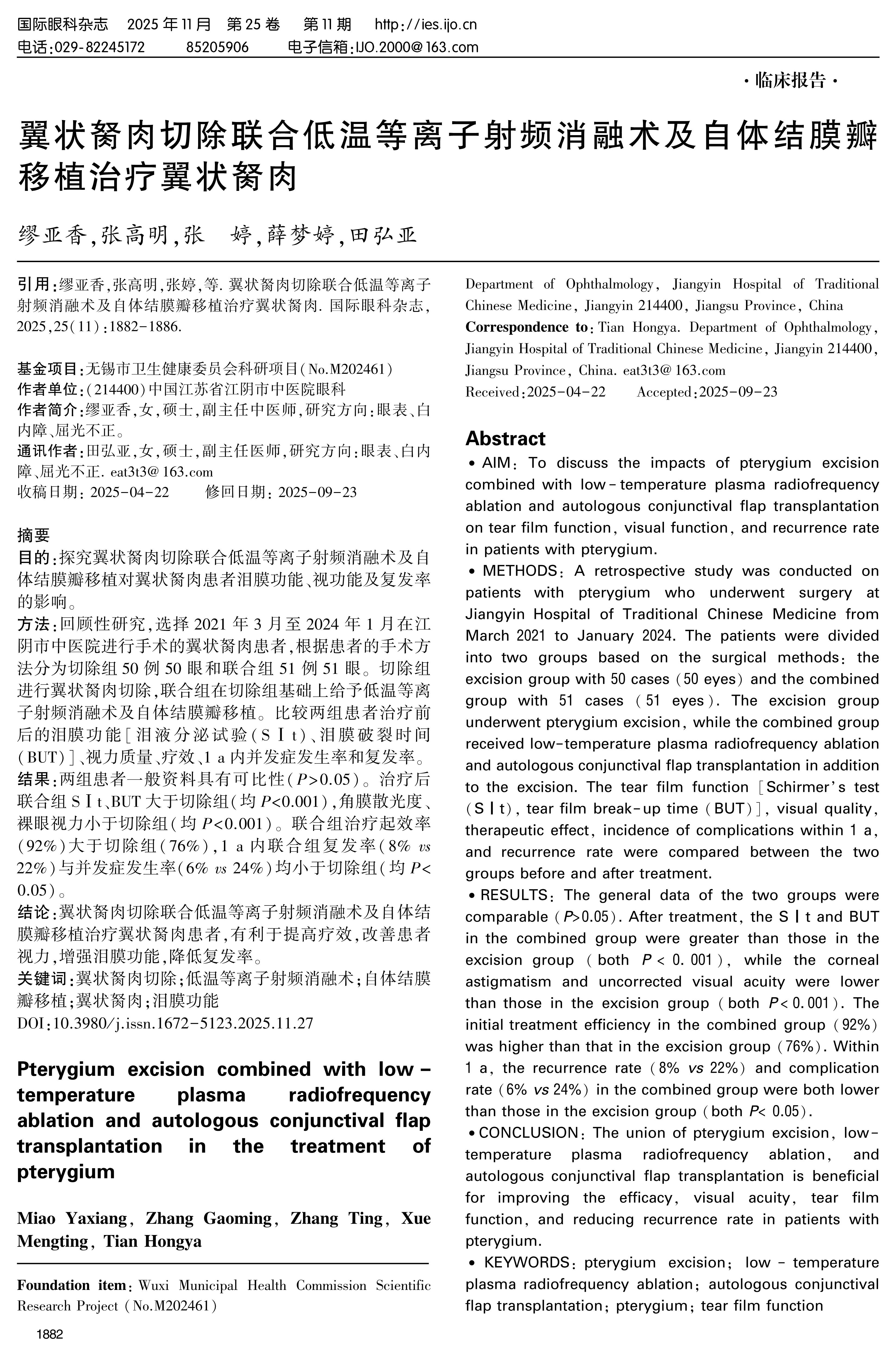 METHODS: A retrospective study was conducted on patients with pterygium who underwent surgery at Jiangyin Hospital of Traditional Chinese Medicine from March 2021 to January 2024. The patients were divided into two groups based on the surgical methods: the excision group with 50 cases(50 eyes)and the combined group with 51 cases(51 eyes). The excision group underwent pterygium excision, while the combined group received low-temperature plasma radiofrequency ablation and autologous conjunctival flap transplantation in addition to the excision. The tear film function \〖Schirmer's test(SⅠt), tear film break-up time(BUT)\〗, visual quality, therapeutic effect, incidence of complications within 1 a, and recurrence rate were compared between the two groups before and after treatment.