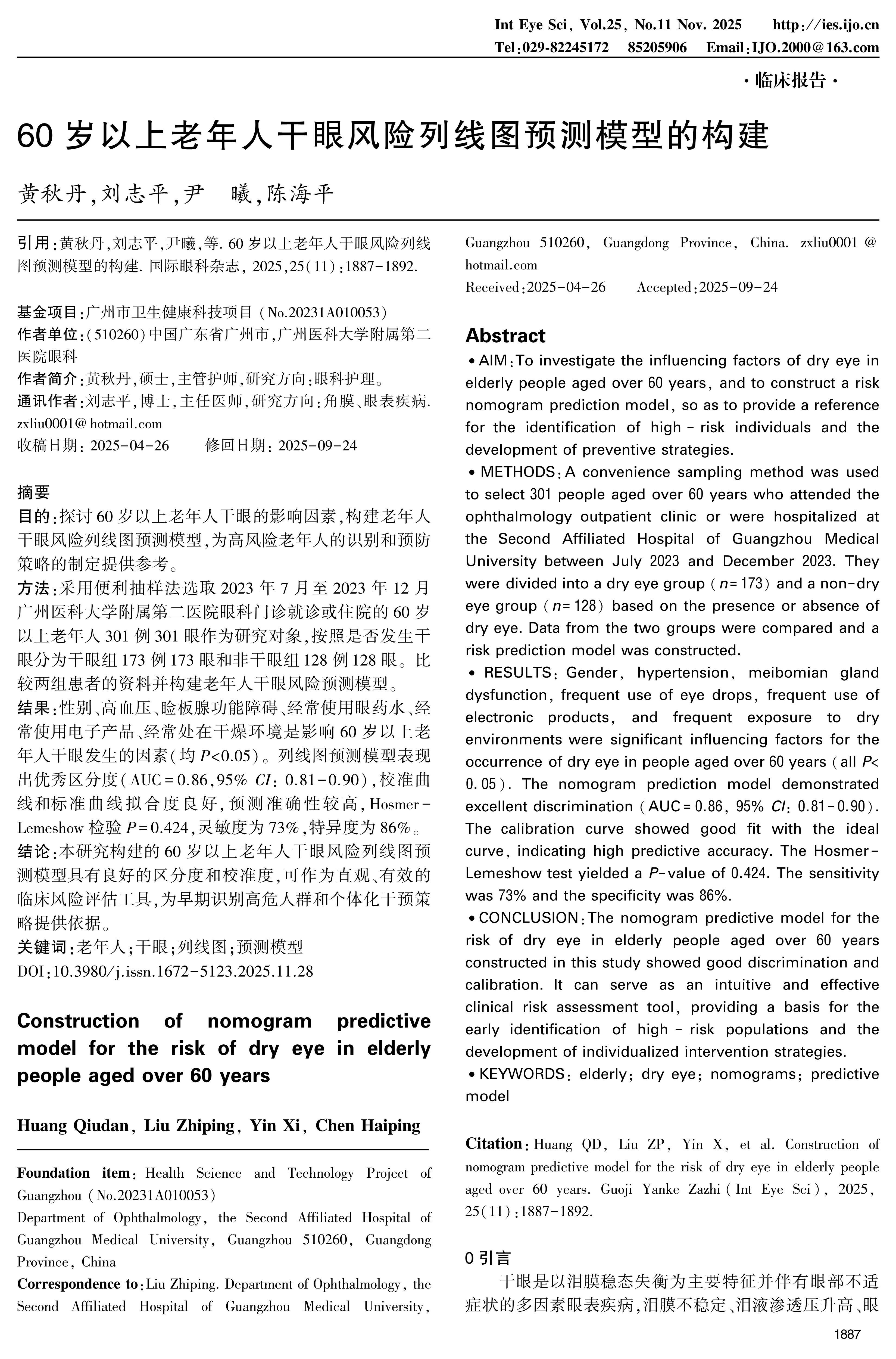 结论:本研究构建的60岁以上老年人干眼风险列线图预测模型具有良好的区分度和校准度,可作为直观、有效的临床风险评估工具,为早期识别高危人群和个体化干预策略提供依据。