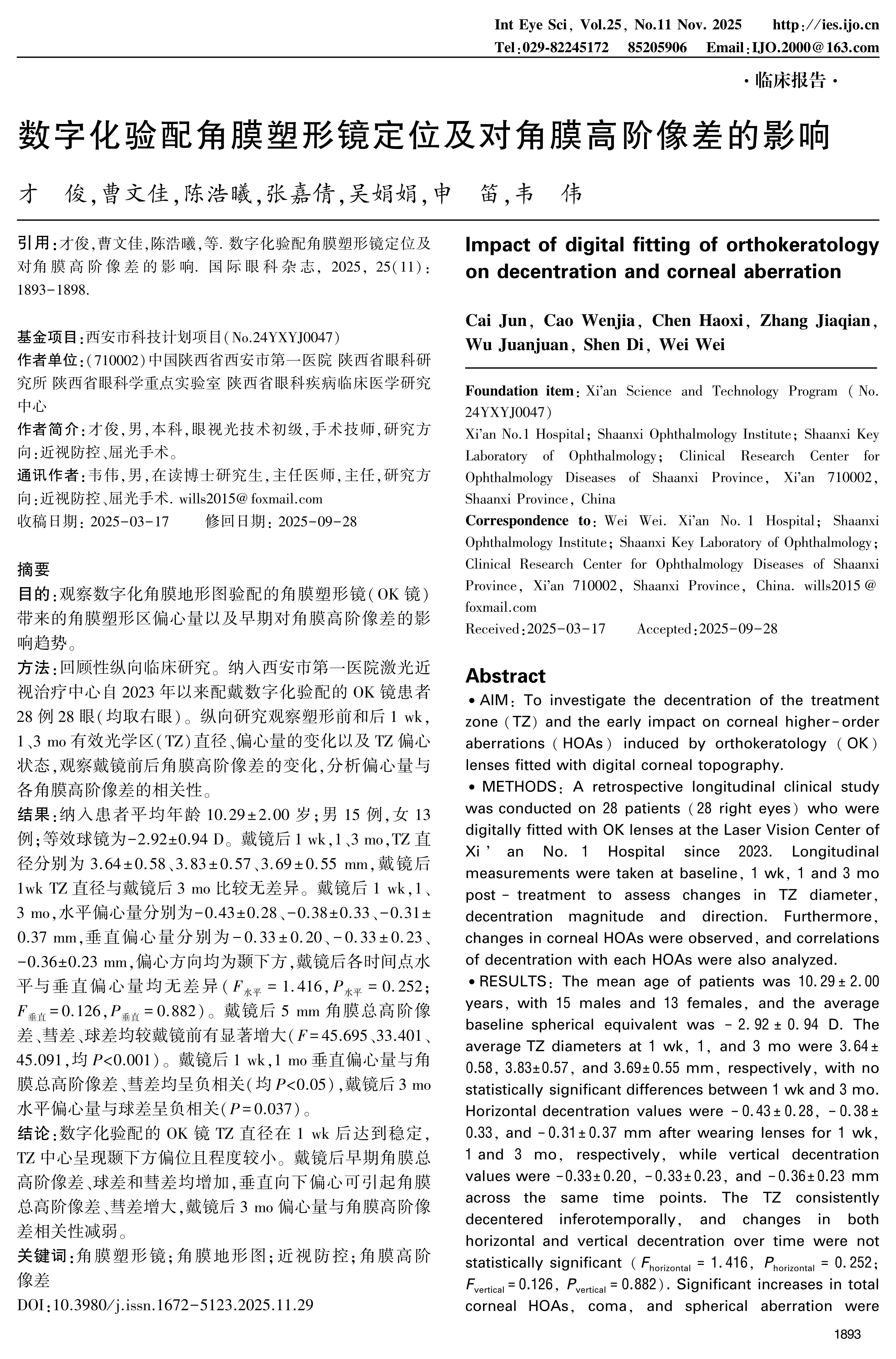 CONCLUSION: Digitally-fitted OK lenses achieved stable TZ diameter by 1 wk post-wear, with minor inferotemporal decentration. Early post-wear corneal total HOAs, coma and sphercal aberration increased significantly, and vertical downward decentration was associated with elevated total HOAs and coma. However, correlations between decentration and HOAs weakened by 3 mo.
