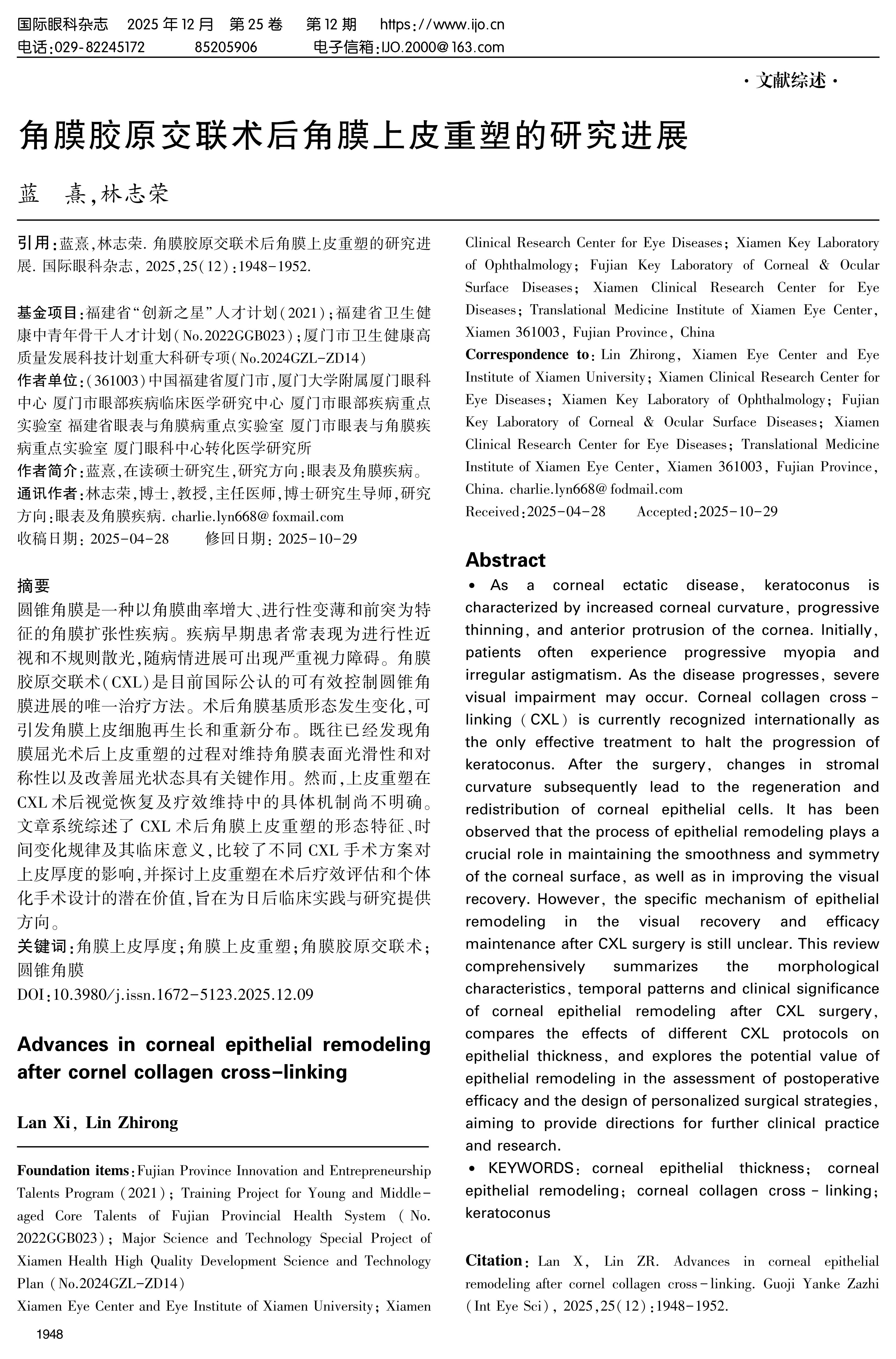 圆锥角膜是一种以角膜曲率增大、进行性变薄和前突为特征的角膜扩张性疾病。疾病早期患者常表现为进行性近视和不规则散光,随病情进展可出现严重视力障碍。角膜胶原交联术(CXL)是目前国际公认的可有效控制圆锥角膜进展的唯一治疗方法。术后角膜基质形态发生变化,可引发角膜上皮细胞再生长和重新分布。既往已经发现角膜屈光术后上皮重塑的过程对维持角膜表面光滑性和对称性以及改善屈光状态具有关键作用。然而,上皮重塑在CXL术后视觉恢复及疗效维持中的具体机制尚不明确。文章系统综述了CXL术后角膜上皮重塑的形态特征、时间变化规律及其临床意义,比较了不同CXL手术方案对上皮厚度的影响,并探讨上皮重塑在术后疗效评估和个体化手术设计的潜在价值,旨在为日后临床实践与研究提供方向。