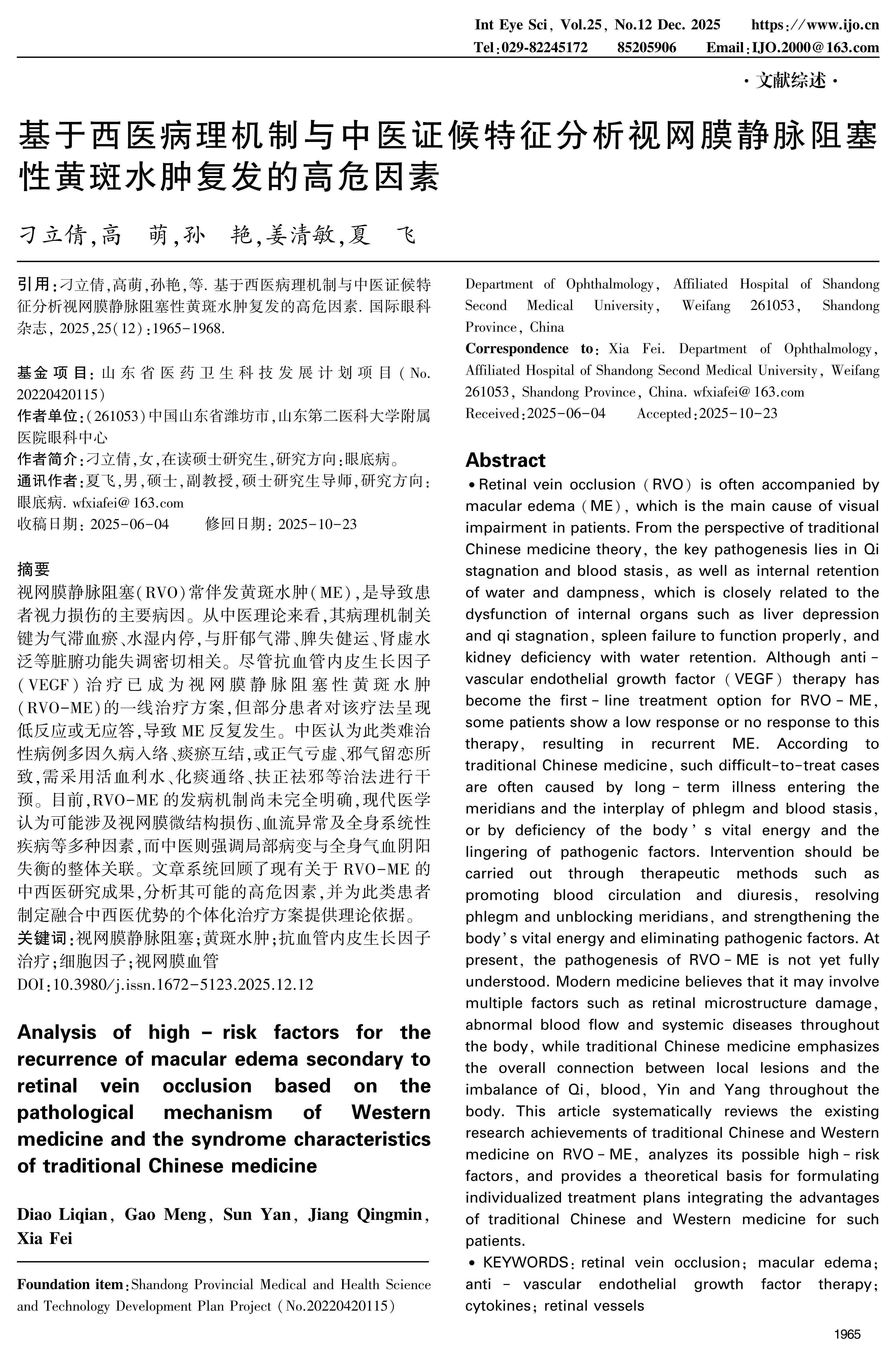 Retinal vein occlusion(RVO)is often accompanied by macular edema(ME), which is the main cause of visual impairment in patients. From the perspective of traditional Chinese medicine theory, the key pathogenesis lies in Qi stagnation and blood stasis, as well as internal retention of water and dampness, which is closely related to the dysfunction of internal organs such as liver depression and qi stagnation, spleen failure to function properly, and kidney deficiency with water retention. Although anti-vascular endothelial growth factor(VEGF)therapy has become the first-line treatment option for RVO-ME, some patients show a low response or no response to this therapy, resulting in recurrent ME. According to traditional Chinese medicine, such difficult-to-treat cases are often caused by long-term illness entering the meridians and the interplay of phlegm and blood stasis, or by deficiency of the body's vital energy and the lingering of pathogenic factors. Intervention should be carried out through therapeutic methods such as promoting blood circulation and diuresis, resolving phlegm and unblocking meridians, and strengthening the body's vital energy and eliminating pathogenic factors. At present, the pathogenesis of RVO-ME is not yet fully understood. Modern medicine believes that it may involve multiple factors such as retinal microstructure damage, abnormal blood flow and systemic diseases throughout the body, while traditional Chinese medicine emphasizes the overall connection between local lesions and the imbalance of Qi, blood, Yin and Yang throughout the body. This article systematically reviews the existing research achievements of traditional Chinese and Western medicine on RVO-ME, analyzes its possible high-risk factors, and provides a theoretical basis for formulating individualized treatment plans integrating the advantages of traditional Chinese and Western medicine for such patients.