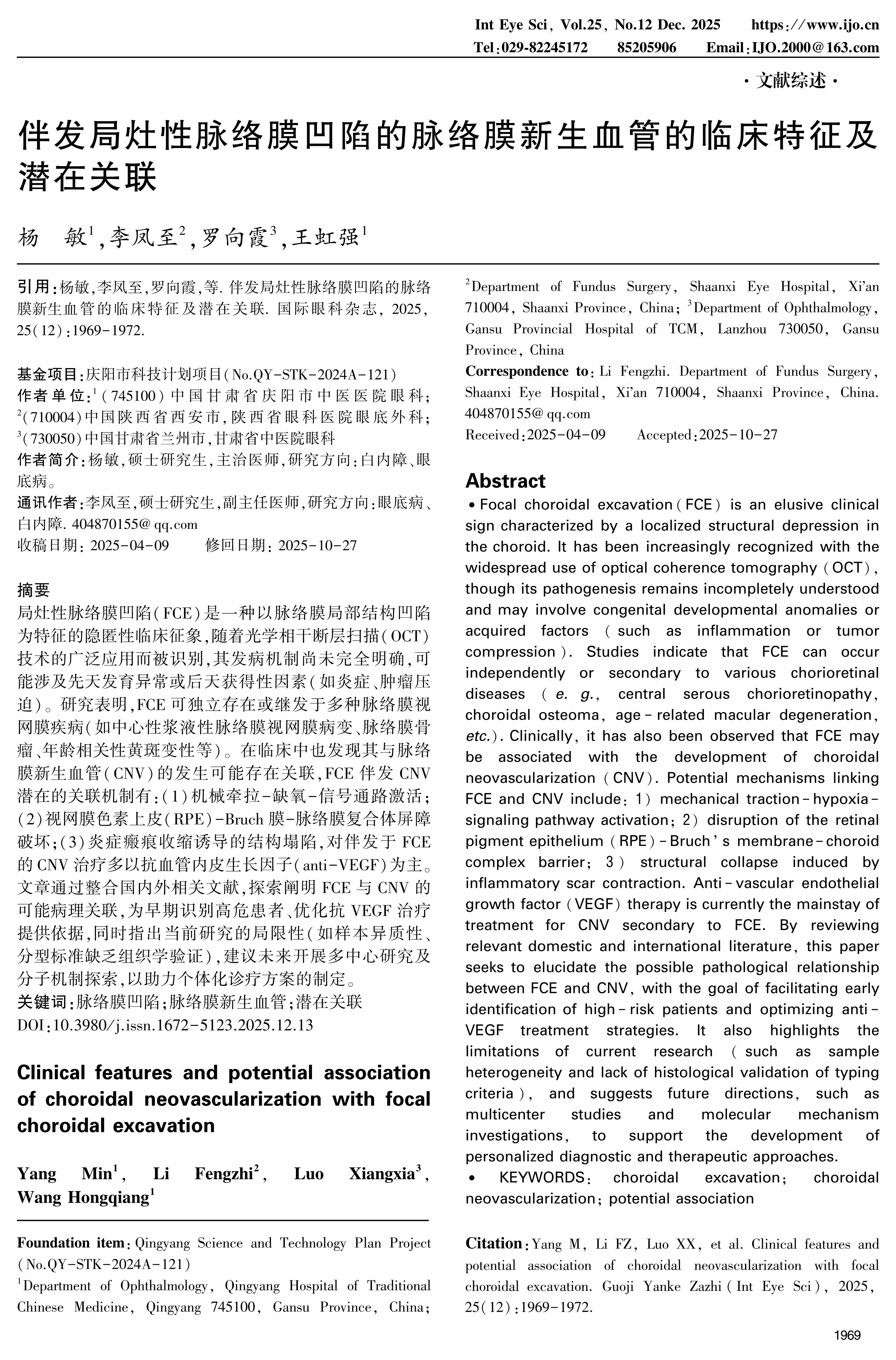 局灶性脉络膜凹陷(FCE)是一种以脉络膜局部结构凹陷为特征的隐匿性临床征象,随着光学相干断层扫描(OCT)技术的广泛应用而被识别,其发病机制尚未完全明确,可能涉及先天发育异常或后天获得性因素(如炎症、肿瘤压迫)。研究表明,FCE可独立存在或继发于多种脉络膜视网膜疾病(如中心性浆液性脉络膜视网膜病变、脉络膜骨瘤、年龄相关性黄斑变性等)。在临床中也发现其与脉络膜新生血管(CNV)的发生可能存在关联,FCE伴发CNV潜在的关联机制有:(1)机械牵拉-缺氧-信号通路激活;(2)视网膜色素上皮(RPE)-Bruch膜-脉络膜复合体屏障破坏;(3)炎症瘢痕收缩诱导的结构塌陷,对伴发于FCE的CNV治疗多以抗血管内皮生长因子(anti-VEGF)为主。文章通过整合国内外相关文献,探索阐明FCE与CNV的可能病理关联,为早期识别高危患者、优化抗VEGF治疗提供依据,同时指出当前研究的局限性(如样本异质性、分型标准缺乏组织学验证),建议未来开展多中心研究及分子机制探索,以助力个体化诊疗方案的制定。