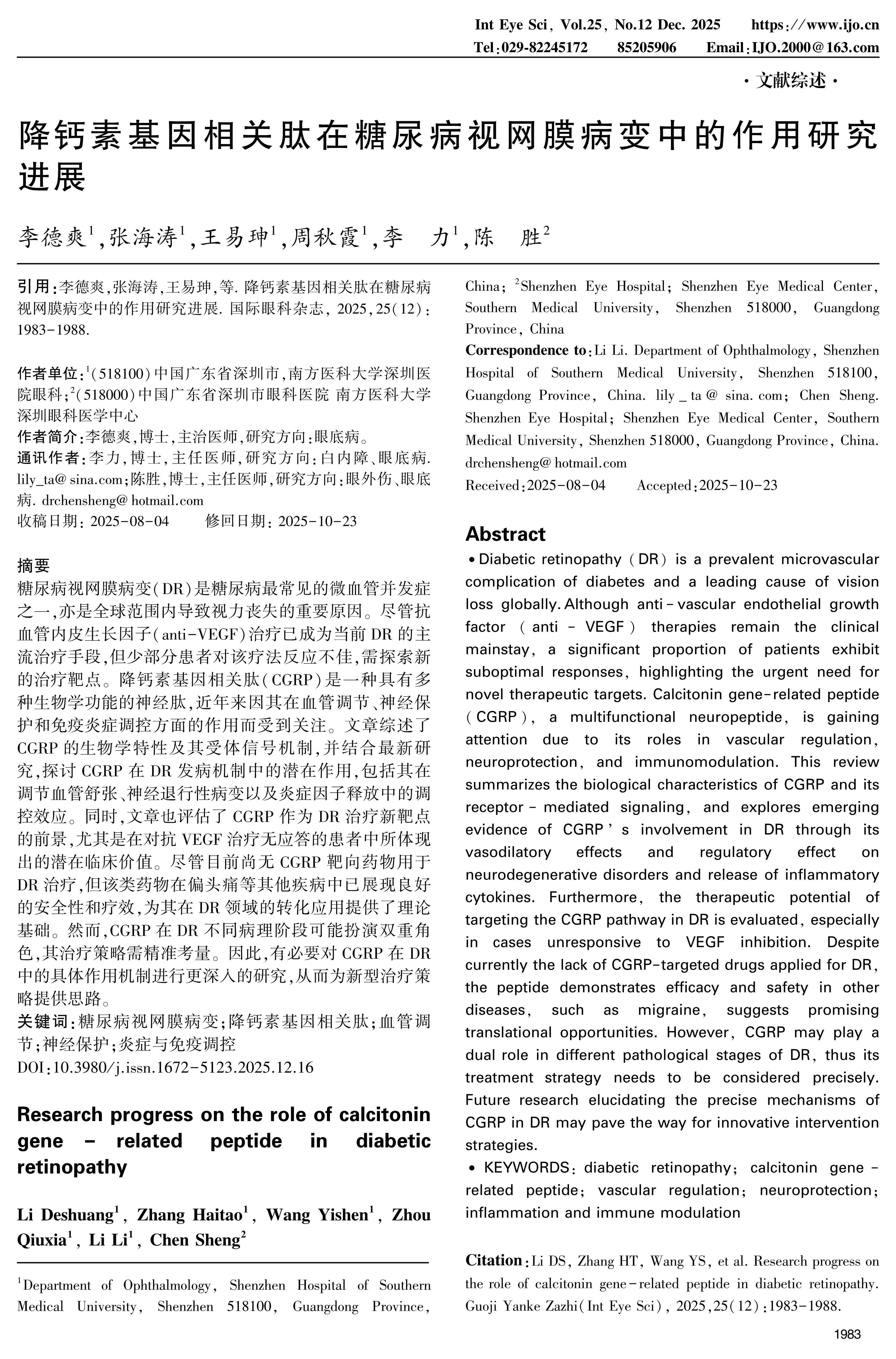 糖尿病视网膜病变(DR)是糖尿病最常见的微血管并发症之一,亦是全球范围内导致视力丧失的重要原因。尽管抗血管内皮生长因子(anti-VEGF)治疗已成为当前DR的主流治疗手段,但少部分患者对该疗法反应不佳,需探索新的治疗靶点。降钙素基因相关肽(CGRP)是一种具有多种生物学功能的神经肽,近年来因其在血管调节、神经保护和免疫炎症调控方面的作用而受到关注。文章综述了CGRP的生物学特性及其受体信号机制,并结合最新研究,探讨CGRP在DR发病机制中的潜在作用,包括其在调节血管舒张、神经退行性病变以及炎症因子释放中的调控效应。同时,文章也评估了CGRP作为DR治疗新靶点的前景,尤其是在对抗VEGF治疗无应答的患者中所体现出的潜在临床价值。尽管目前尚无CGRP靶向药物用于DR治疗,但该类药物在偏头痛等其他疾病中已展现良好的安全性和疗效,为其在DR领域的转化应用提供了理论基础。然而,CGRP在DR不同病理阶段可能扮演双重角色,其治疗策略需精准考量。因此,有必要对CGRP在DR中的具体作用机制进行更深入的研究,从而为新型治疗策略提供思路。