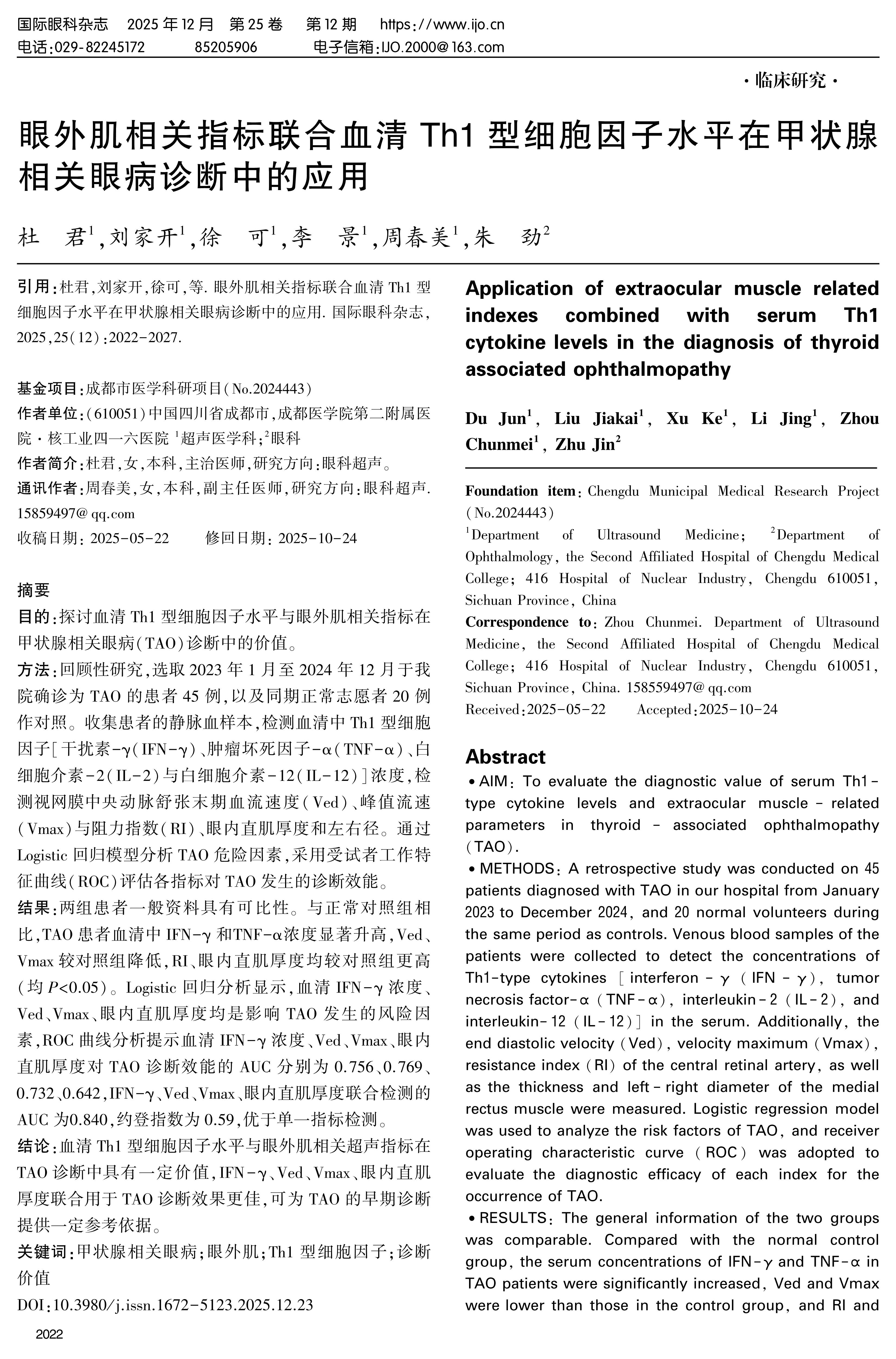 CONCLUSION: The levels of serum Th1-type cytokines and extraocular muscle-related ultrasound indicators have certain value in the diagnosis of TAO. The combination of IFN-γ, Ved, Vmax, and the thickness of the medial rectus muscle has better diagnosis efficiency in TAO, which can provide a certain reference for the early diagnosis of TAO.