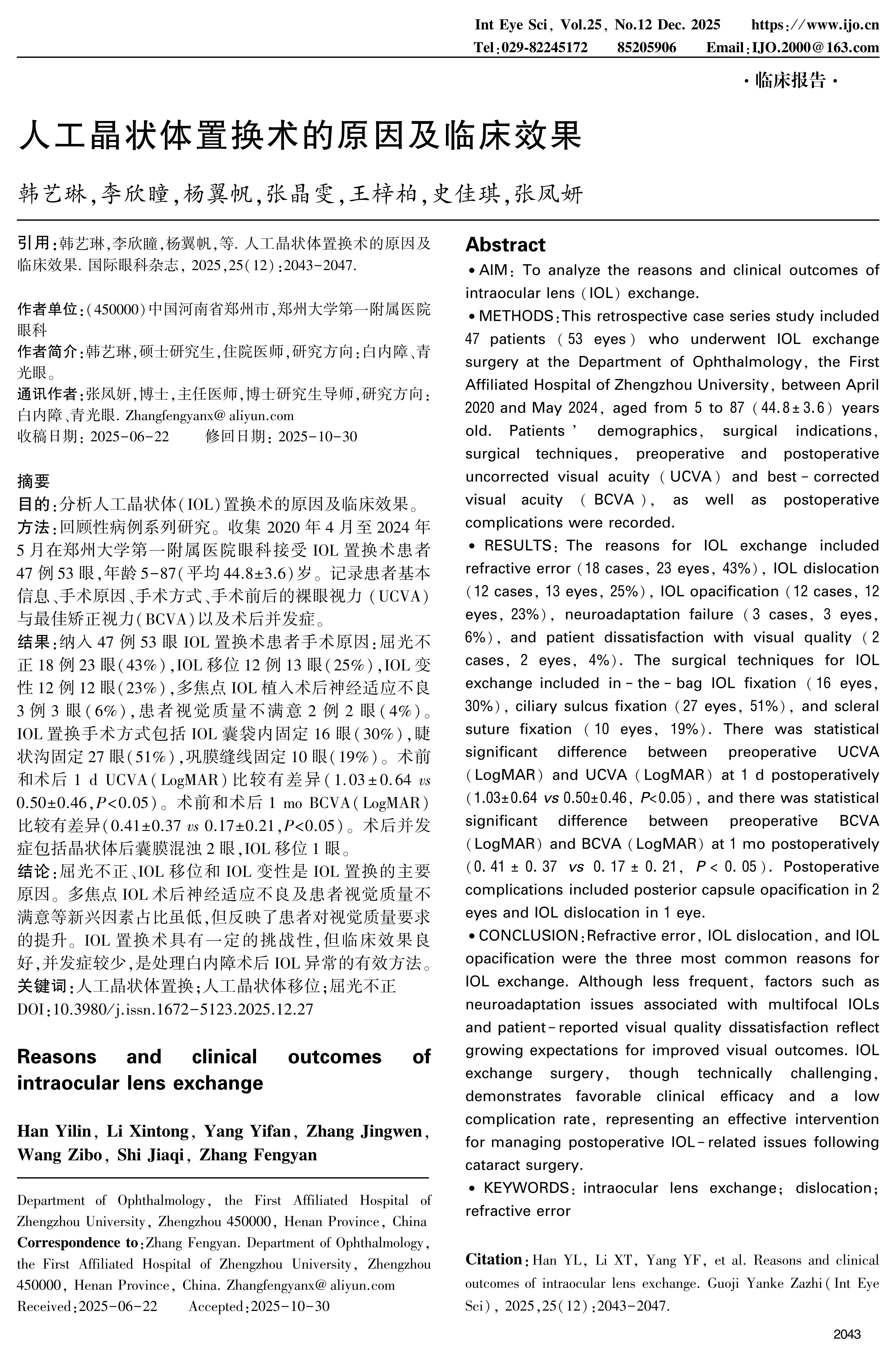 CONCLUSION:Refractive error, IOL dislocation, and IOL opacification were the three most common reasons for IOL exchange. Although less frequent, factors such as neuroadaptation issues associated with multifocal IOLs and patient-reported visual quality dissatisfaction reflect growing expectations for improved visual outcomes. IOL exchange surgery, though technically challenging, demonstrates favorable clinical efficacy and a low complication rate, representing an effective intervention for managing postoperative IOL-related issues following cataract surgery.