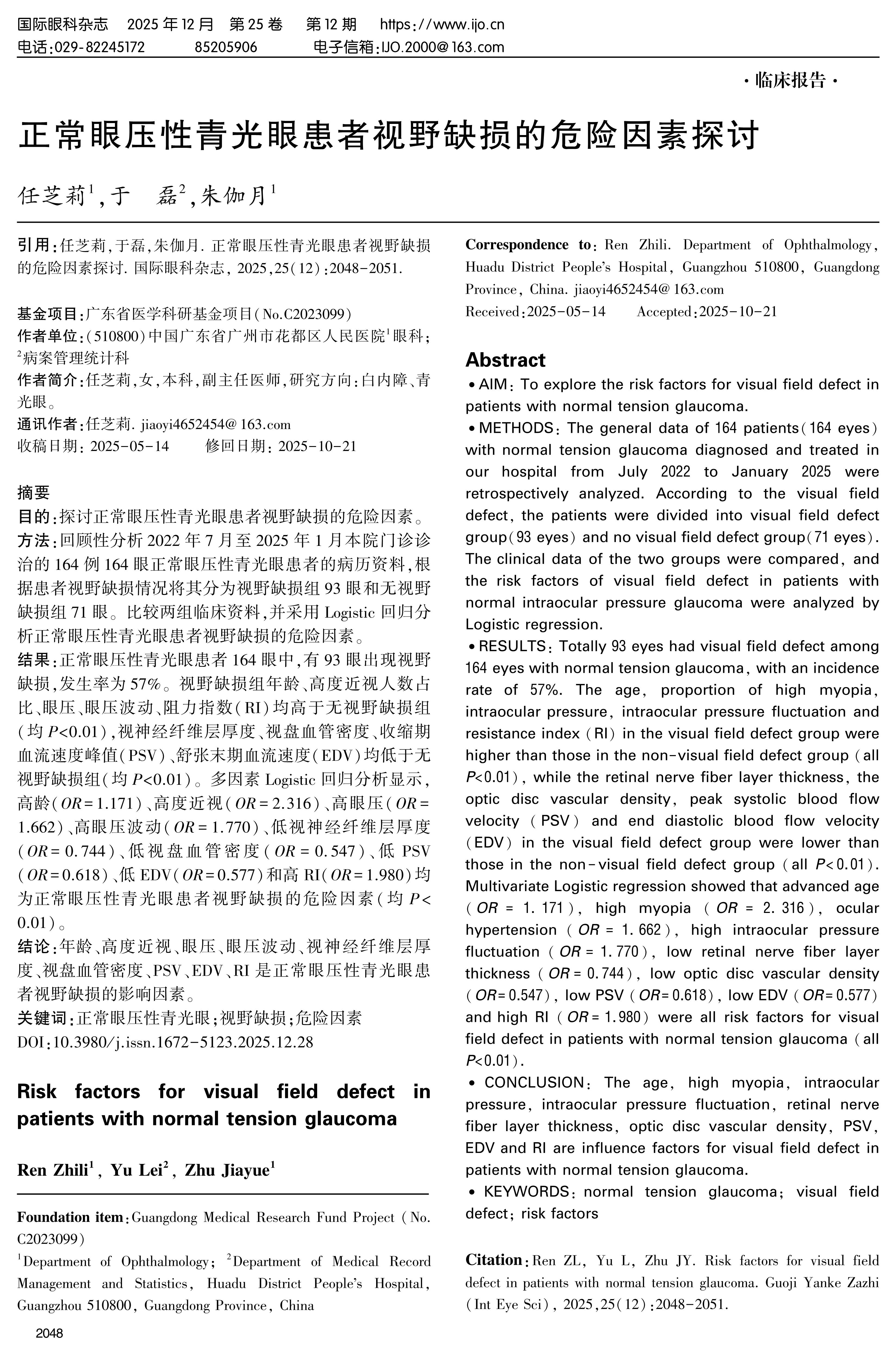 METHODS: The general data of 164 patients(164 eyes)with normal tension glaucoma diagnosed and treated in our hospital from July 2022 to January 2025 were retrospectively analyzed. According to the visual field defect, the patients were divided into visual field defect group(93 eyes)and no visual field defect group(71 eyes). The clinical data of the two groups were compared, and the risk factors of visual field defect in patients with normal intraocular pressure glaucoma were analyzed by Logistic regression.