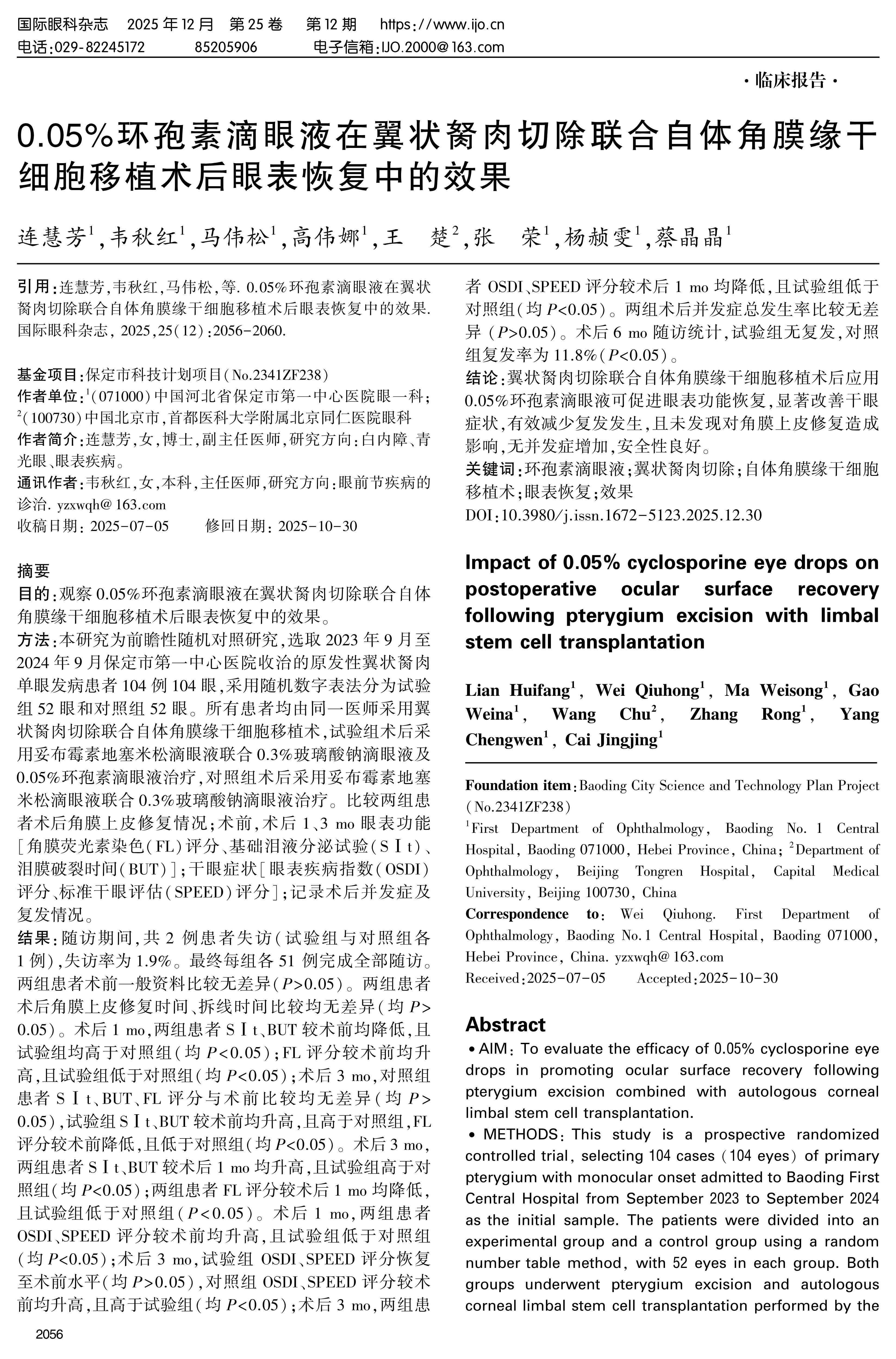 目的:观察0.05%环孢素滴眼液在翼状胬肉切除联合自体角膜缘干细胞移植术后眼表恢复中的效果。