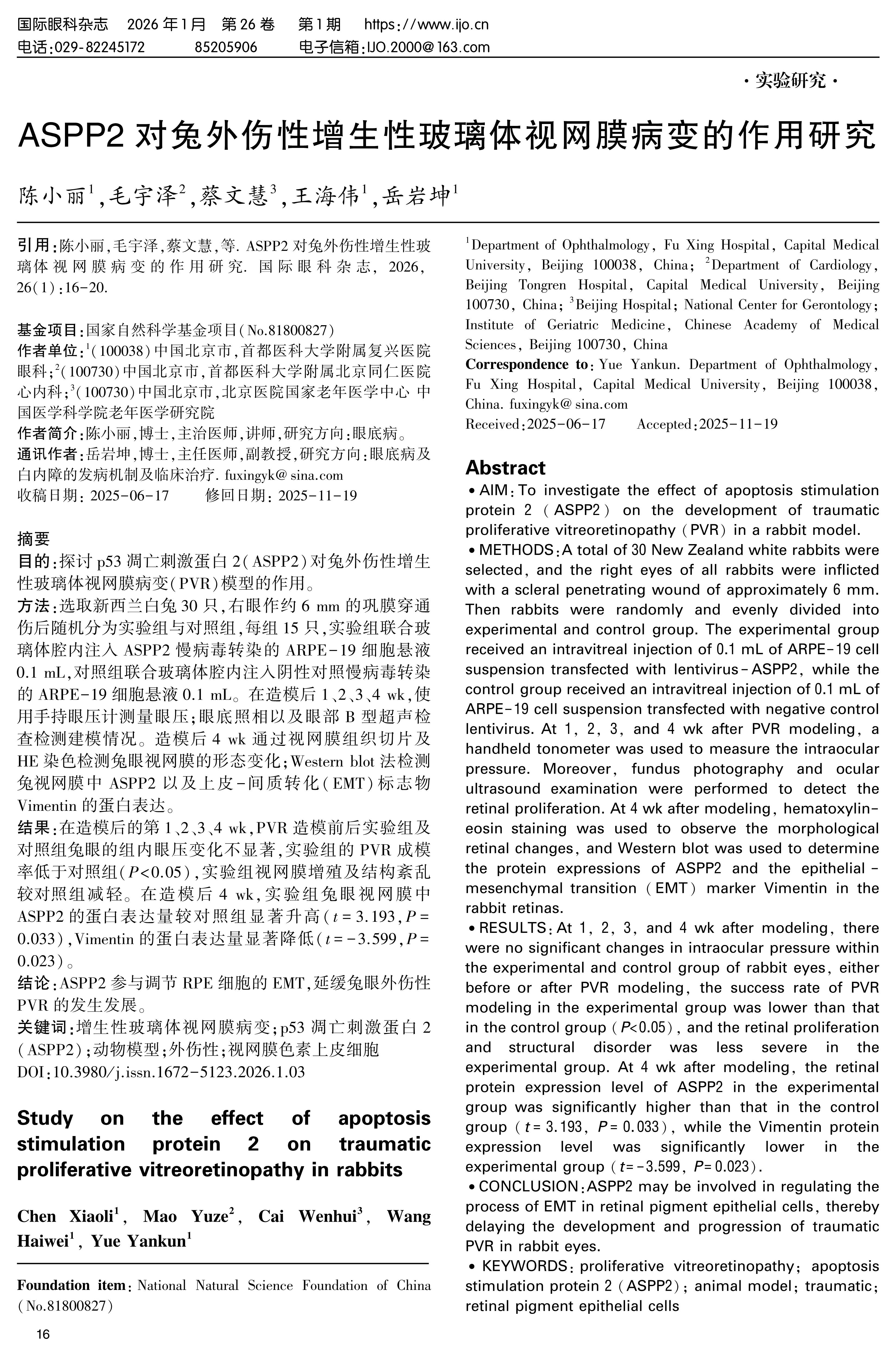 CONCLUSION:ASPP2 may be involved in regulating the process of EMT in retinal pigment epithelial cells, thereby delaying the development and progression of traumatic PVR in rabbit eyes.