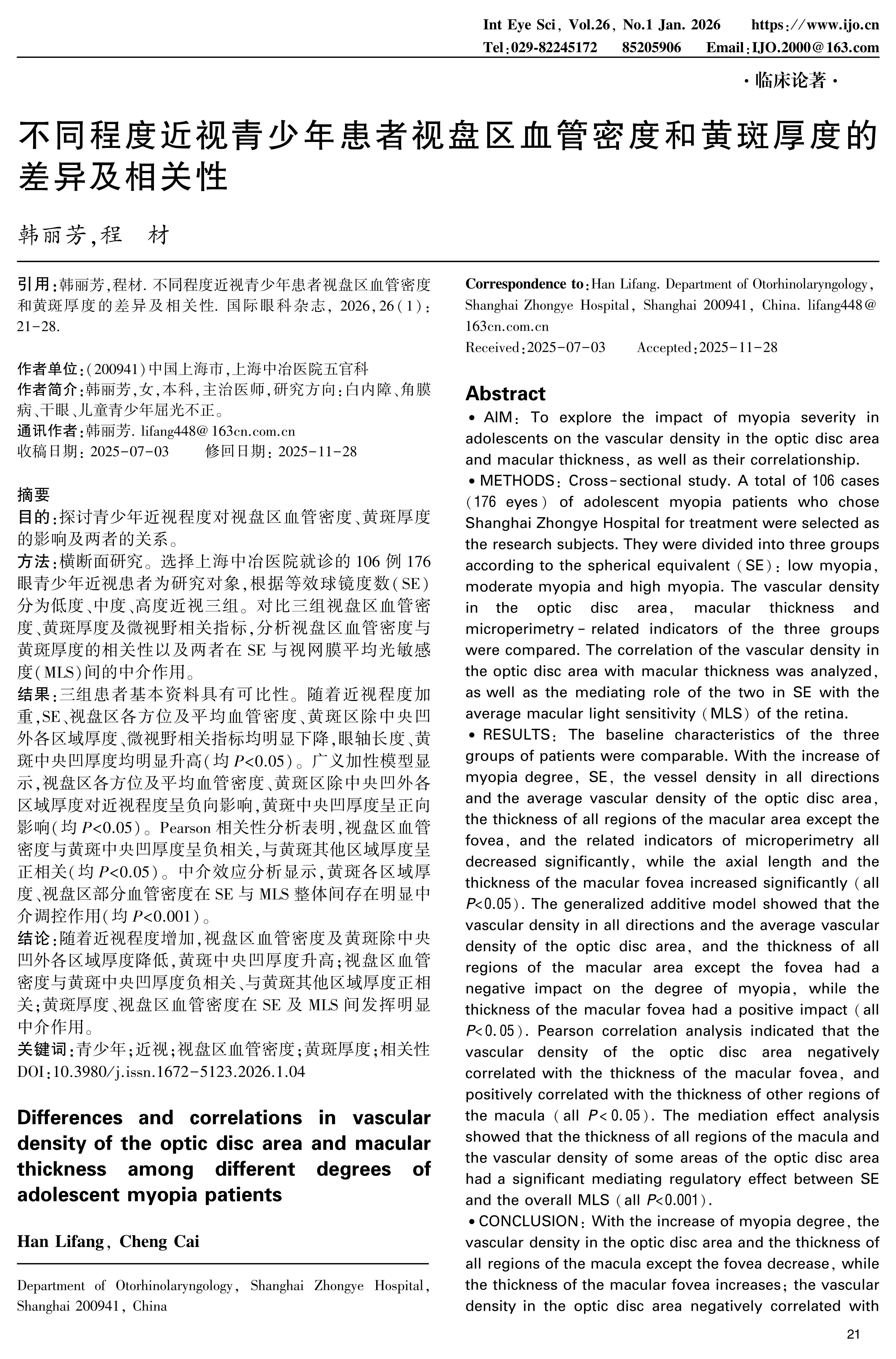 不同程度近视青少年患者视盘区血管密度和黄斑厚度的差异及相关性