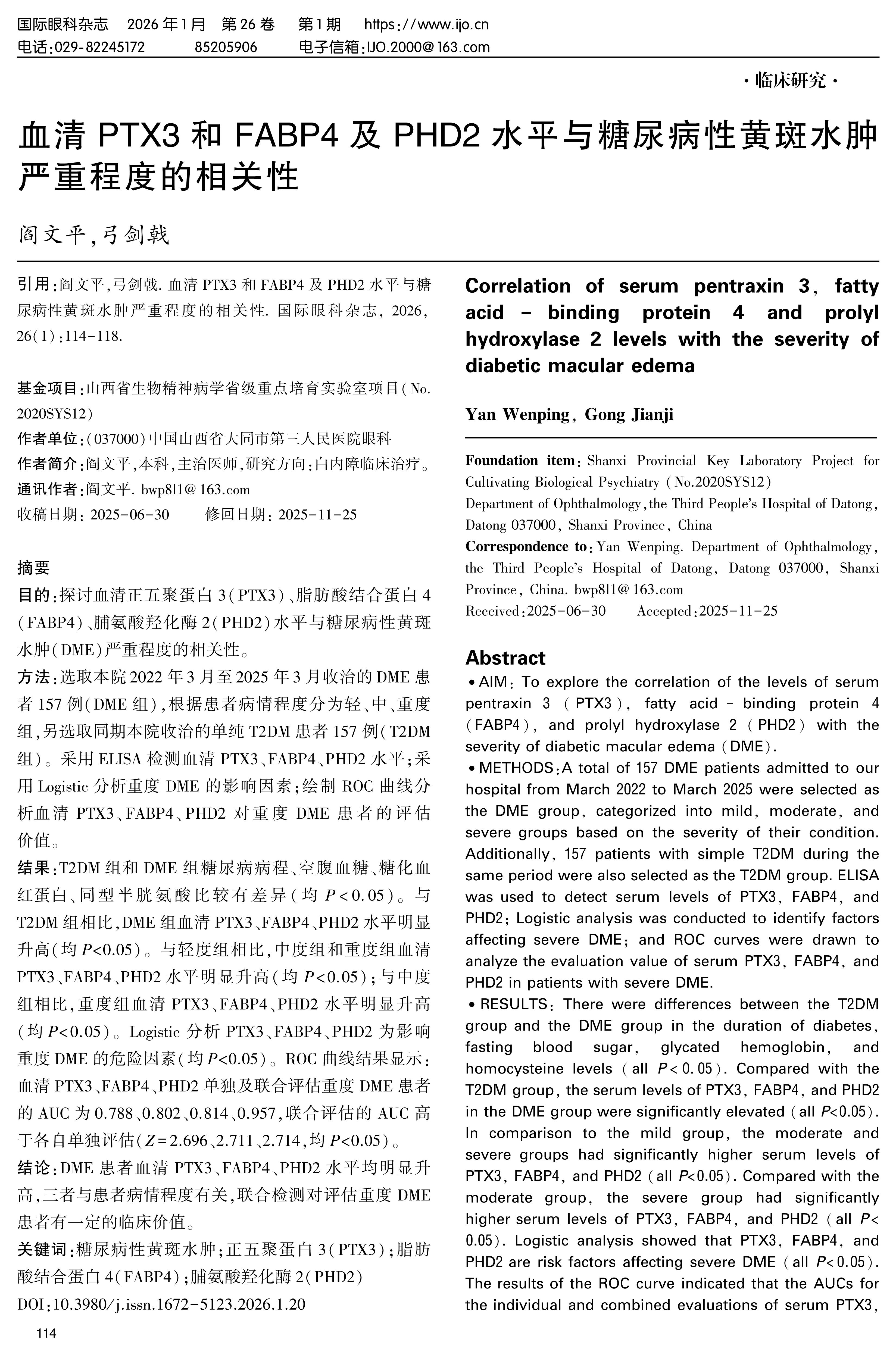 CONCLUSION: Serum levels of PTX3, FABP4, and PHD2 are significantly elevated in patients with DME, and the three are associated with the severity of the patients' condition. Combined testing has a certain clinical value in assessing patients with severe DME.