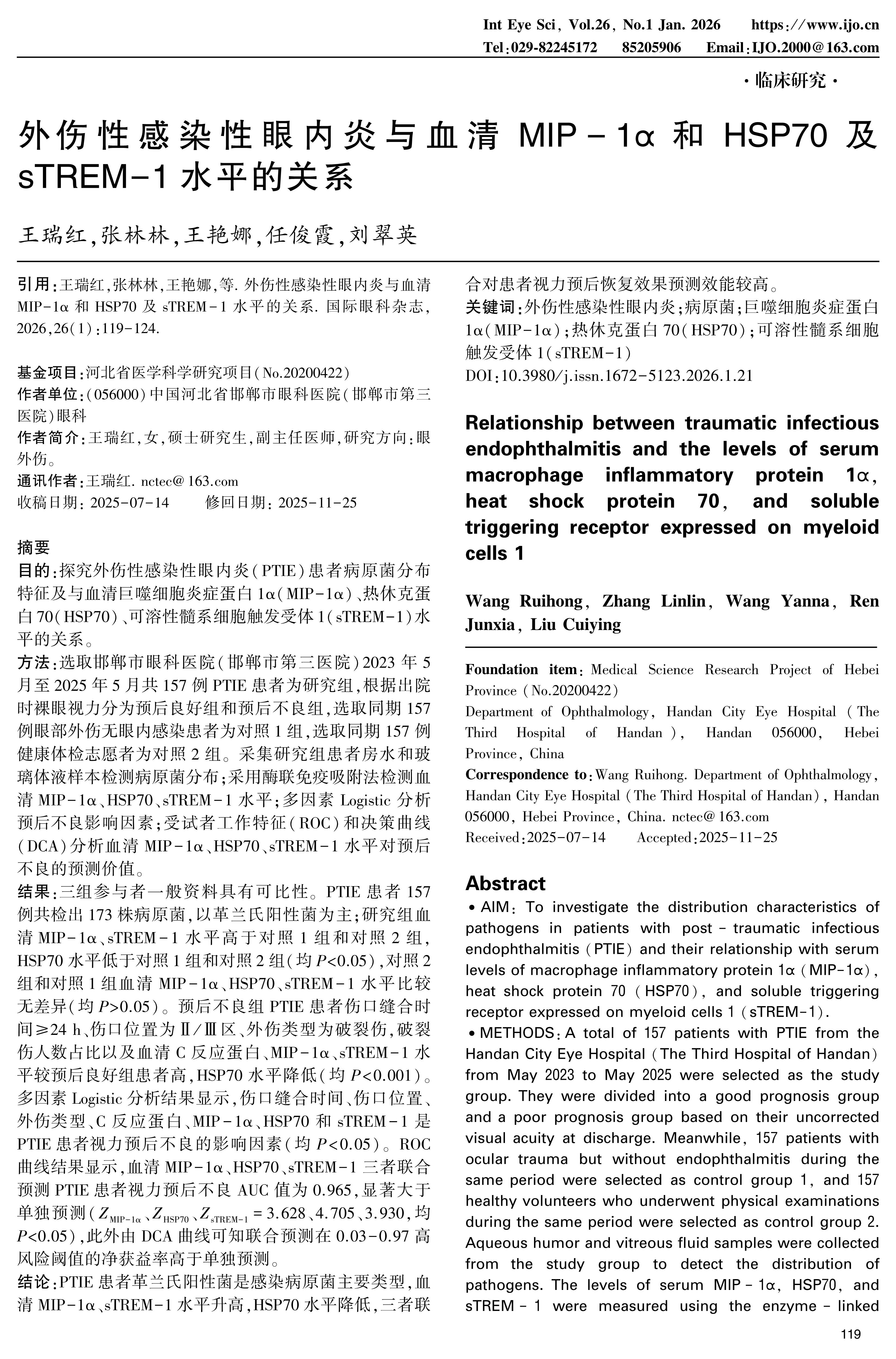 RESULTS: The general data of the participants in the three groups was comparable. A total of 173 pathogens were detected in the 157 patients with PTIE, with Gram-positive bacteria being the predominant type. The levels of serum MIP-1α and sTREM-1 in the study group were higher than those in control groups 1 and 2, while the level of HSP70 was lower than those in control groups 1 and 2(all P<0.05). There were no significant differences in the levels of serum MIP-1α, HSP70, and sTREM-1 between control groups 1 and 2(all P>0.05). In the poor prognosis group, the time of wound suture was ≥24 h, the wound location was in zones II/III, the type of trauma was rupture, the proportion of rupture injuries, and the levels of serum C-reactive protein, MIP-1α, and sTREM-1 were higher than those in the good prognosis group, while the level of HSP70 was decreased(all P<0.001). Multivariate Logistic regression analysis showed that the time of wound suture, wound location, type of trauma, C-reactive protein, MIP-1α, HSP70, and sTREM-1 were risk factors for poor visual prognosis in patients with PTIE(all P<0.05). The ROC curve results showed that the combined prediction of serum MIP-1α, HSP70, and sTREM-1 for poor visual prognosis in PTIE patients had an AUC value of 0.965, which was significantly higher than that of individual predictions(ZMIP-1α, ZHSP70, ZsTREM-1=3.628, 4.705, 3.930, all P<0.05). Additionally, the DCA curve showed that the combined prediction had a higher net benefit rate than individual predictions in the high-risk threshold range of 0.03-0.97.